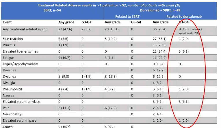 结果显示,尽管联合治疗组达到了延长至疾病进展时间(TTP)的主要终点,但PFS和总生存期(OS)未见显著差异。安全性方面,度伐利尤单抗相关不良事件以1-2级为主,最常见为皮肤反应(39%)、瘙痒(24%)和乏力(22%),2例患者出现3级事件(皮肤反应和肺炎)。