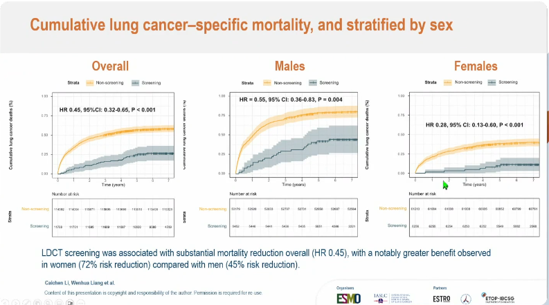 中位随访7年结果显示,筛查组肺癌累积死亡率显著降低(HR 0.45,95%CI 0.32–0.65,p<0.001)。在性别分层分析中,男性(HR 0.55)和女性(HR 0.28)均显示获益。