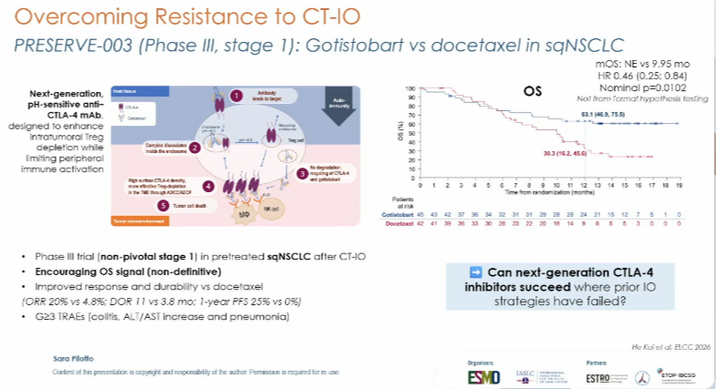 PRESERVE-003试验(摘要号:3O):该研究的Ⅰ期结果显示,新型CTLA-4抑制剂gotistobart相较于多西他赛,在鳞癌患者中展现出显著的OS获益(HR 0.46),12个月OS率为63.1%vs 30.3%,且中位DoR达11个月。Sara Pilotto教授指出,尽管LATIFY结果阴性,但gotistobart在鳞癌后线治疗中展现出令人鼓舞的潜力,其确证性部分值得期待[19]。