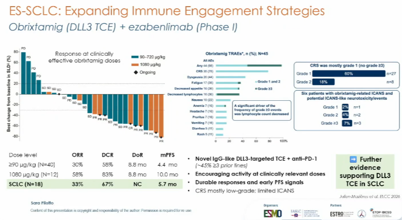 obrixtamig联合ezabenlimab(摘要号:409O):obrixtamig(DLL3 T细胞衔接器)联合ezabenlimab在DLL3阳性神经内分泌肿瘤中的I期研究显示,在最高剂量组(1080μg/kg)ORR达58%,中位PFS达10个月,且细胞因子释放综合征均为1-2级,未发生≥3级CRS[23]。