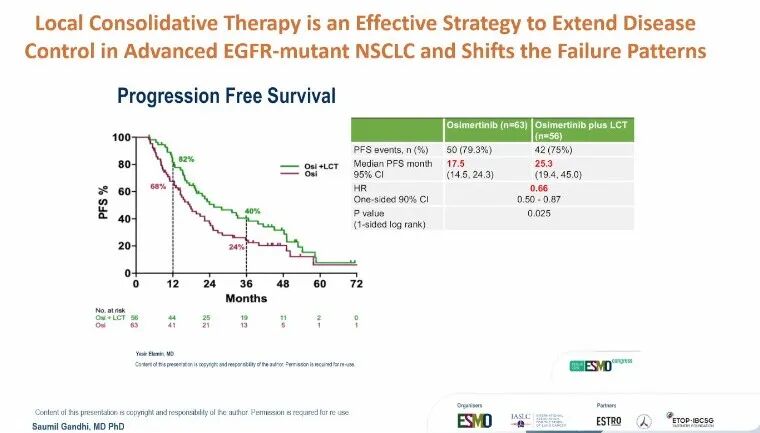 Andreas Rimmer教授重点解读了NorthStar研究的二次分析结果[1]。该研究针对EGFR突变型局部晚期或转移性非小细胞肺癌(NSCLC)患者,在诱导奥希替尼6-12周后,随机分配至继续单药治疗或联合局部巩固治疗(手术或放疗)。结果显示,联合治疗组中位无进展生存期(PFS)从17.5个月显著提升至25个月。