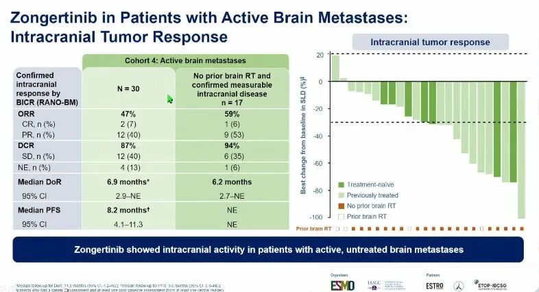 最后,Andreas Rimmer教授简要提及了Beamion LUNG-1研究中zongertinib的颅内活性[4]。该研究纳入HER2突变型NSCLC患者,在初治队列(74例)中,客观缓解率(ORR)达76%,中位PFS为14.4个月。尤为值得关注的是,在活动性脑转移队列(30例)中,颅内客观缓解率(iORR)达47%;其中17例有可测量中枢神经系统病变且未接受过脑放疗的患者,iORR高达59%,中位颅内缓解持续时间(IC-DoR)为6.2个月。这些数据表明,zongertinib作为高颅内渗透性的靶向药物,为HER2突变合并脑转移患者提供了推迟或避免放疗的可能,进一步体现了精准靶向时代对局部治疗时机的重塑。