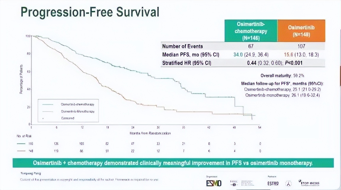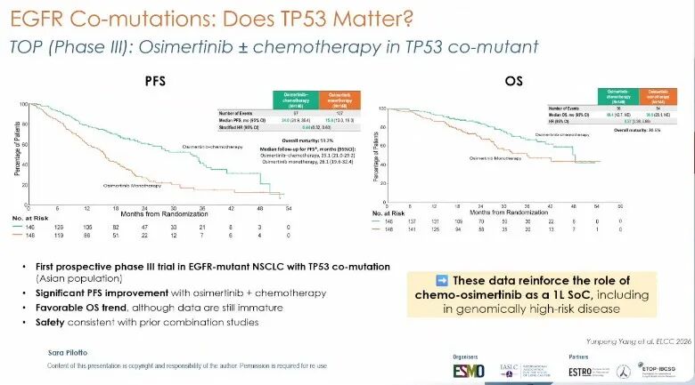 TOP研究(摘要号:2O):该III期研究针对EGFR突变合并TP53共突变这一高风险人群,随机比较奥希替尼联合化疗与奥希替尼单药一线治疗的疗效。结果显示,联合治疗组中位PFS达34.0个月,显著优于单药组的15.6个月(HR 0.44,p<0.001),ORR分别为82.9%和72.0%,中位DoR分别为32.7个月和15.3个月。尽管OS数据尚未成熟,但已观察到获益趋势(HR 0.57)。安全性方面,联合治疗组≥3级治疗相关不良事件发生率为62.4%,未发现新的安全信号。Pilotto教授指出,该研究为TP53共突变这一既往预后更差的人群提供了治疗强化的明确循证依据[7]。
