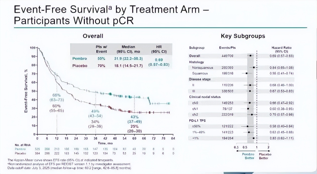 在达pCR的患者亚组中,帕博利珠单抗组pCR率为18.1%,安慰剂组仅4.0%,5年EFS率分别为80.8%和55.7%(HR 0.37)。