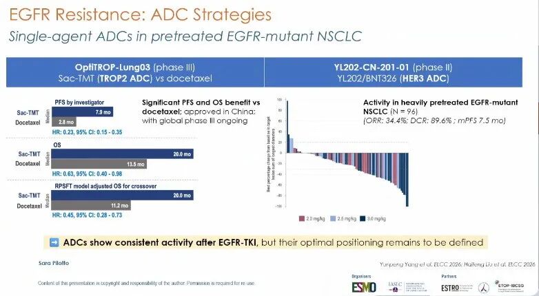 OptiTROP-Lung03研究(摘要号:LBA4):在耐药后治疗方面,OptiTROP-Lung03研究最终总生存分析显示,TROP2靶向ADC药物芦康沙妥珠单抗(sac-TMT)相较于多西他赛,在EGFR突变经治患者中持续展现PFS和OS获益。中位随访23.8个月时,PFS HR为0.23,OS HR为0.63;经交叉治疗校正后,OS HR为0.45。sac-TMT组未报告间质性肺炎病例[12]。