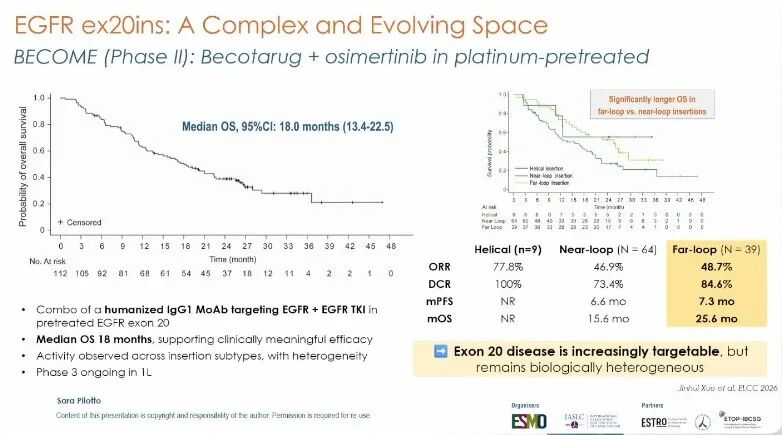 BECOME研究(摘要号:7MO):对于EGFR 20外显子插入突变,BECOME研究最终分析显示,becotarug联合奥希替尼在铂类经治人群中中位总生存期为18.0个月。值得注意的是,不同插入位置亚型间存在疗效异质性:远环插入患者相较于近环插入患者显示出更长的OS(HR 0.58,p=0.03);基线ctDNA阴性患者较阳性患者也展现出更优的PFS和OS。Sara Pilotto教授指出,该研究揭示了EGFR ex20ins内部的分子异质性,为后续精准治疗策略提供了重要方向[14]。