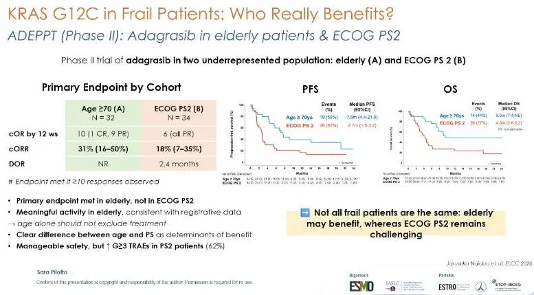 ADEPPT研究(摘要号:5MO):在KRAS突变NSCLC领域,Sara Pilotto教授重点介绍了ADEPPT研究。该研究针对KRAS G12C突变型经治NSCLC,分别入组老年(≥70岁,ECOG PS 0-1)和体力状态不佳(ECOG PS 2)患者接受adagrasib治疗。结果显示,老年队列达到主要终点,ORR为31%,中位PFS 7.6个月;而PS 2队列未达主要终点,ORR为18%,中位PFS 2.7个月,且≥3级治疗相关不良事件发生率高达62%。Sara Pilotto教授重点指出,年龄本身不应成为治疗限制,但体力状态是制约靶向治疗获益的关键因素[15]。