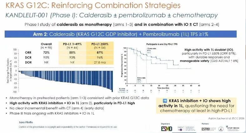 KANDLELIT-001研究(摘要号:4MO):更令人瞩目的是,KANDLELIT-001研究更新结果显示,新型KRAS G12C抑制剂MK-1084联合帕博利珠单抗在PD-L1 TPS≥50%的初治患者中ORR达92%,中位PFS达28.9个月,且≥3级ALT/AST升高发生率低于10%。该研究为KRAS G12C抑制剂联合免疫治疗在first-line的应用注入强劲信心,并支撑了正在进行的III期KANDLELIT-004研究[16]。