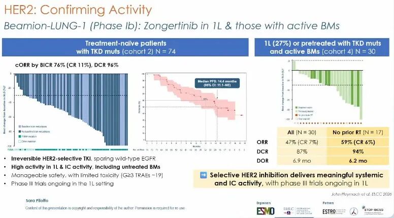 Beamion LUNG-1研究(摘要号:6MO):该研究中zongertinib一线治疗ORR达76%,中位PFS 14.4个月;在活动性脑转移患者中,iORR达47%,其中未接受过脑放疗的患者iORR高达59%。Pilotto教授指出,HER2已成为明确的驱动靶点,且zongertinib的高颅内渗透性为合并脑转移患者提供了推迟放疗的可能[4]。