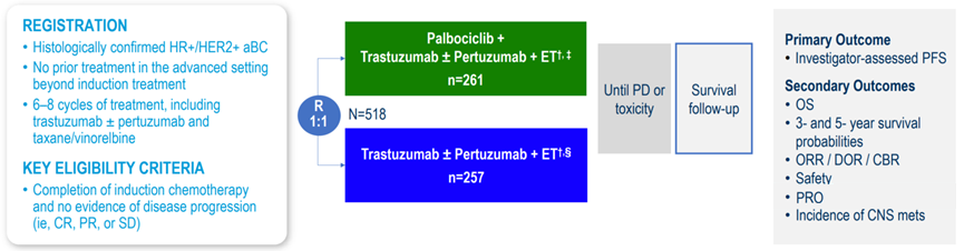 PATINA研究是首个在HR+/HER2+晚期乳腺癌一线维持治疗中,比较标准治疗方案联合与不联合CDK4/6抑制剂哌柏西利的疗效及安全性的III期研究。这项国际多中心、随机对照的III期研究共纳入518例患者,入组条件为接受4~8个周期化疗联合HER2靶向治疗后未出现疾病进展。患者按1:1随机分为两组:对照组接受H±P联合ET治疗的基础维持方案,试验组在对照组基础上加用CDK4/6抑制剂哌柏西利。ET治疗包括芳香化酶抑制剂(AI)或氟维司群,绝经前患者要求接受卵巢功能抑制。主要研究终点为无进展生存期(PFS),次要研究终点包括客观缓解率(ORR)、总生存期(OS)及安全性等。