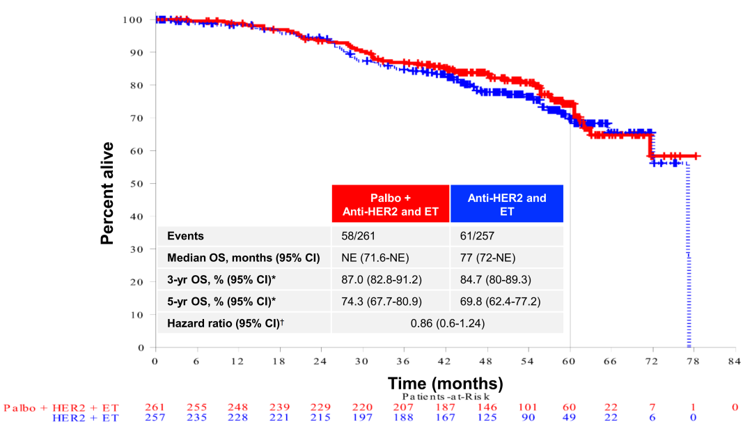 数据截止时,研究共报告123例死亡事件,其中哌柏西利联合H±P+ET组60例、H±P+ET组63例。OS目前尚不成熟,需达到247个死亡事件后再予分析。哌柏西利联合H±P+ET组5年OS率较H±P+ET组呈改善趋势(74.3%vs 69.8%),死亡风险降低14%(HR=0.86,95%CI,0.61-1.23)。上述结果表明,在HR+/HER2+晚期乳腺癌一线维持抗HER2治疗联合ET治疗的基础上,加用CDK4/6抑制剂可进一步提升整体治疗效果,为延长患者生存奠定了基础。