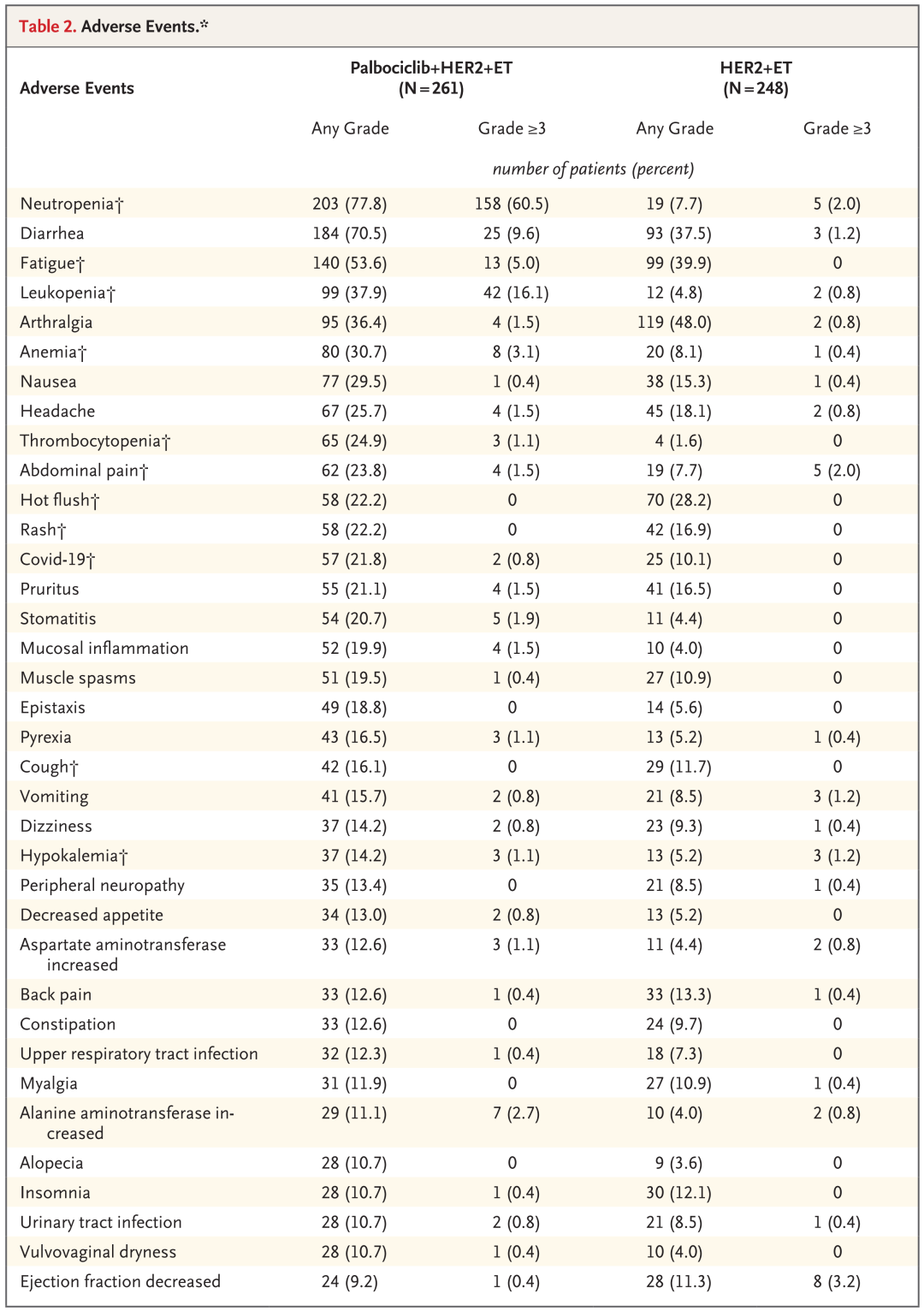 安全性结果显示,哌柏西利联合H±P+ET组与H±P+ET组相比,任意级别不良事件发生率相当,均为94.4%;但≥3级不良事件的发生率显著升高,分别为79.7%vs.30.6%,其中以中性粒细胞减少(60.5%vs 2.0%)和白细胞减少(16.1%vs 0.8%)最为常见。中性粒细胞减少也是该研究中导致剂量降低的最常见不良事件。此外,哌柏西利联合H±P+ET组在乏力、腹泻、口腔炎等不良事件的发生率也高于对照组,临床实践中需要加强相关不良反应的管理。