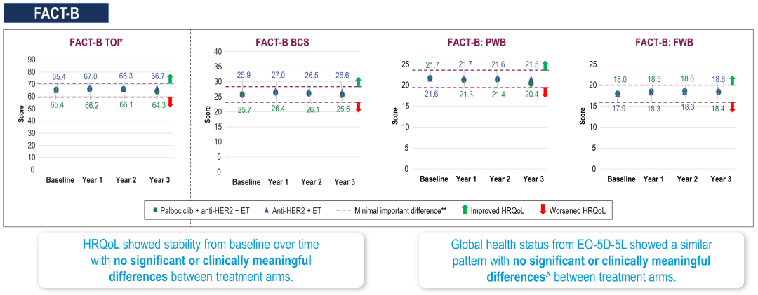 - 2025年欧洲肿瘤内科学会(ESMO)年会公布了该研究健康相关生活质量(HRQOL)结果,提示在抗HER2靶向治疗联合ET治疗的维持方案中加用CDK4/6抑制剂未对患者生活质量造成显著影响[6]。