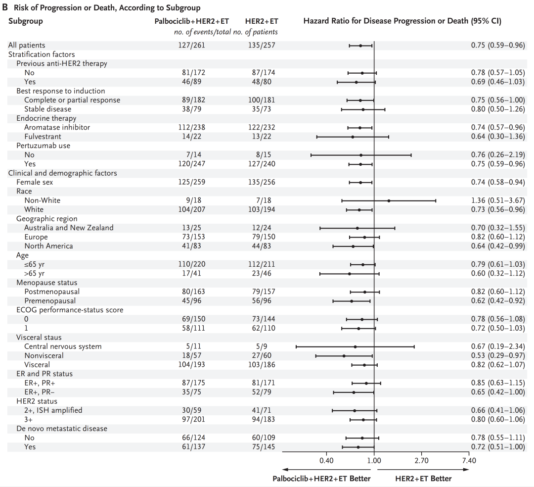 中位随访53.5个月时,哌柏西利联合H±P+ET组较H±P+ET组显著延长了mPFS(44.3个月vs 29.1个月),疾病进展或死亡风险降低了25%(HR=0.75;95%CI,0.59-0.96;双侧未分层P=0.02,分层P=0.03)。两组5年PFS率分别为43.2%和33.4%。亚组分析显示,哌柏西利联合H±P+ET组在各亚组中均呈现获益趋势,其中AI治疗组相比氟维司群组、无内脏转移组相比内脏转移组、绝经前组相比绝经后组、ER+/PR-组相比ER+/PR+组的获益趋势更为显著。