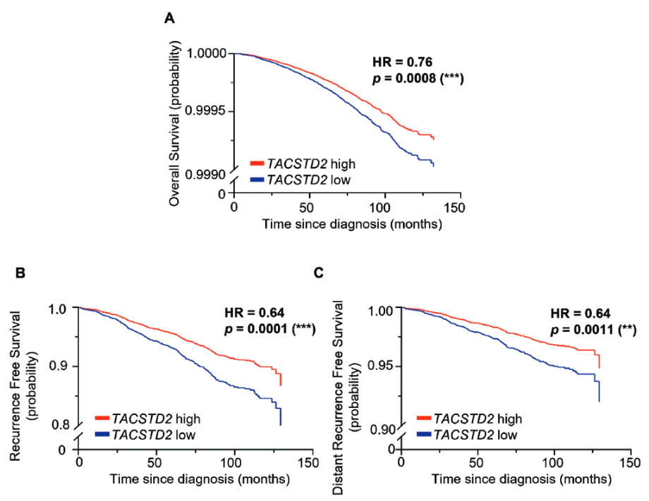 图2.根据TACSTD2表达水平分层的HR+/HER2-乳腺癌Kaplan-Meier生存分析