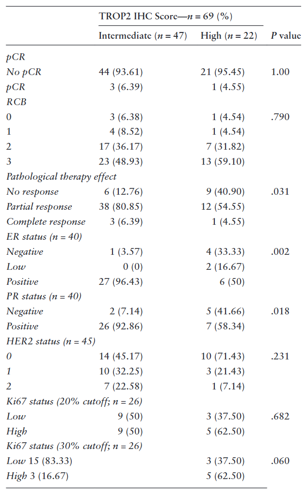 表3.基线TROP2免疫组化评分与新辅助化疗后临床病理参数的相关性