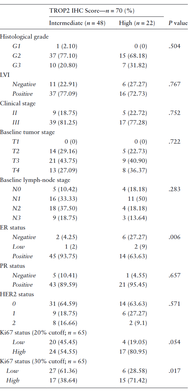 表2.TROP2免疫组化评分与新辅助化疗前基线临床病理参数的相关性