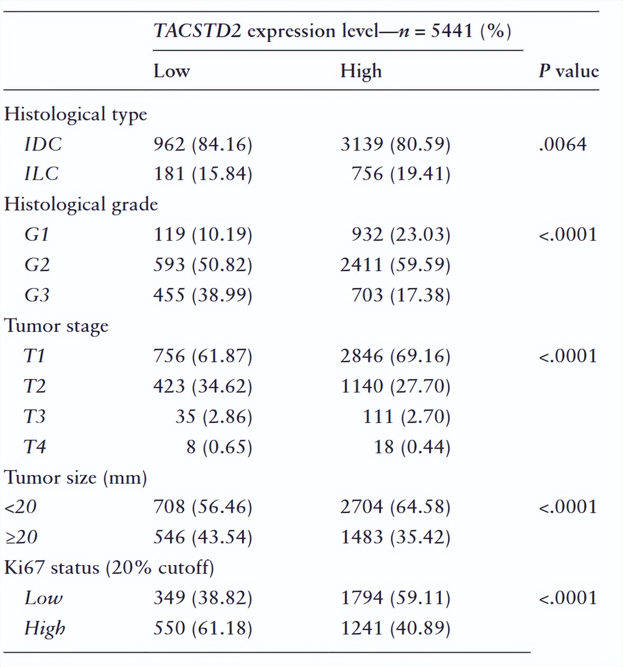 SCAN-B队列(5441例)中位随访86.5个月。高TACSTD2表达与浸润性小叶癌组织学类型(P=0.0064)、低组织学分级(P<0.0001)、早期肿瘤分期(P<0.0001)、小肿瘤(<20mm,P<0.0001)及低Ki67(<20%,P<0.0001)显著相关。