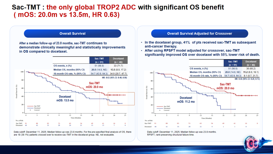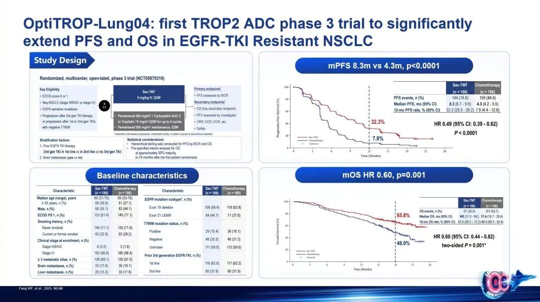 OptiTROP-Lung04是首个单药治疗晚期EGFR-TKI耐药NSCLC患者,PFS和OS均取得显著获益的Ⅲ期临床研究,结果显示,与化疗相比,芦康沙妥珠单抗可显著延长患者中位PFS(8.3个月vs 4.3个月,HR:0.49,P<0.0001)与中位OS(未达到vs 17.4个月,HR:0.60,P=0.001)。数据显示,芦康沙妥珠单抗的中位OS有望延长至30个月,且药物安全性与患者依从性表现良好。该药已成为EGFR-TKI耐药后机制未明人群的核心治疗选择,为ADC药物在靶向耐药NSCLC领域的应用提供了重要循证依据。