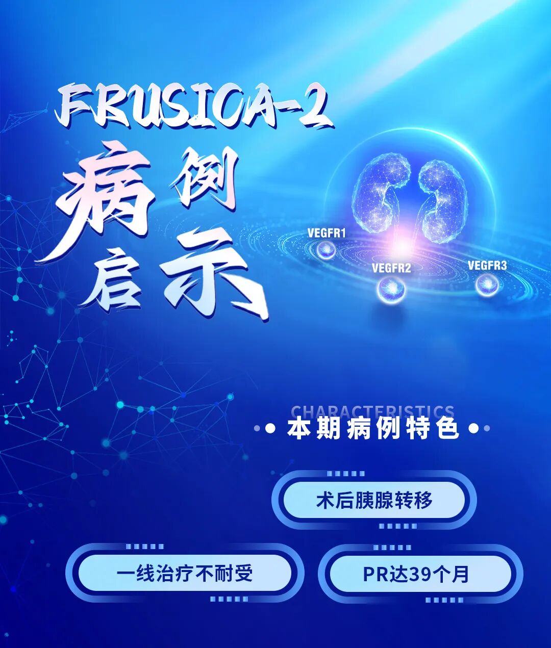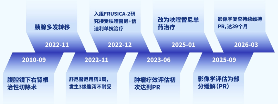 编者按:对于肾细胞癌(RCC)患者而言,7%~30%的患者在根治术后5年内出现局部复发,20%~40%的患者最终出现远处转移;在所有转移靶器官中,肺、骨、肝和脑是常见转移部位,而胰腺转移的发生率在2%~5%之间[1]。与此同时,晚期RCC一线酪氨酸激酶抑制剂(TKI)治疗可能会出现治疗相关不良反应,部分患者甚至因严重不耐受被迫暂停治疗;而对于靶向联合免疫作为二线治疗方案,既往尚缺乏高级别、大样本III期确证性研究的循证医学证据。2025年欧洲肿瘤内科学会(ESMO)年会报道的III期FRUSICA-2研究结果展现了呋喹替尼联合信迪利单抗在晚期肾癌二线治疗的疗效和安全性方面的潜力。本期病例报告中,分享了一例来自FRUSICA-2研究的病例,该患者肾癌根治术后发现胰腺转移,对舒尼替尼治疗不耐受,接受呋喹替尼联合信迪利单抗二线治疗并序贯呋喹替尼单药治疗,截至报道前最近一次(2026年3月)随访,部分缓解(PR)已持续39个月,且治疗期间患者耐受性良好,为该治疗策略的临床应用提供了实践参考。