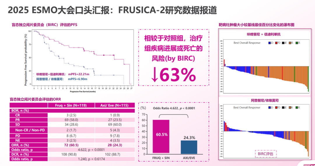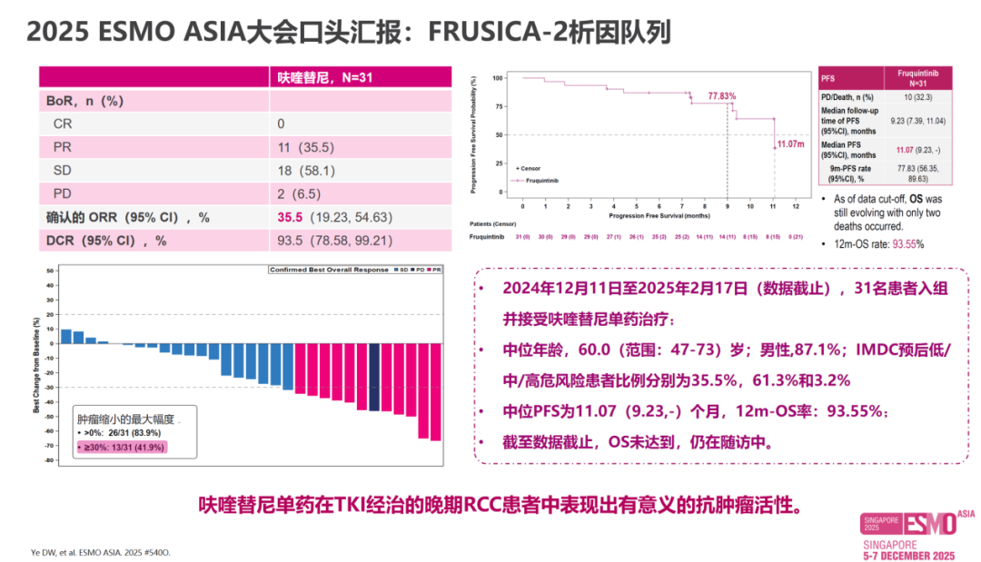 2025年ESMO Asia报道的FRUSICA-2研究的第2部分[10]则进一步展现了呋喹替尼单药二线治疗在疗效和安全性方面的潜力,ORR达35.5%,中位PFS达11.07个月,有望为临床提供灵活的治疗选择。