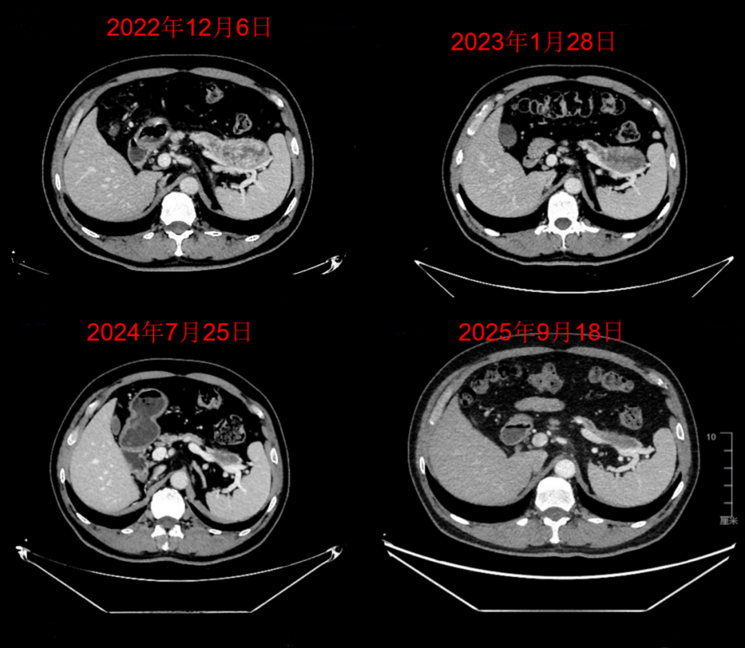 △基线(2022年12月6日)及不同时间点随访的上腹部CT胰尾部肿瘤变化
