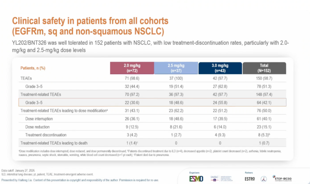 安全性结果:YL202/BNT326总体耐受性良好。治疗相关不良事件(TRAEs)主要为血液学及胃肠道反应,多为1–2级。在2.0 mg/kg和2.5 mg/kg剂量组中,治疗中断率较低(分别为4.2%和2.7%)。药物相关间质性肺病(ILD)发生率为2.6%(4例),其中3例为1–2级,1例为3级。仅1例患者因治疗相关肺炎死亡(2.0 mg/kg组)。