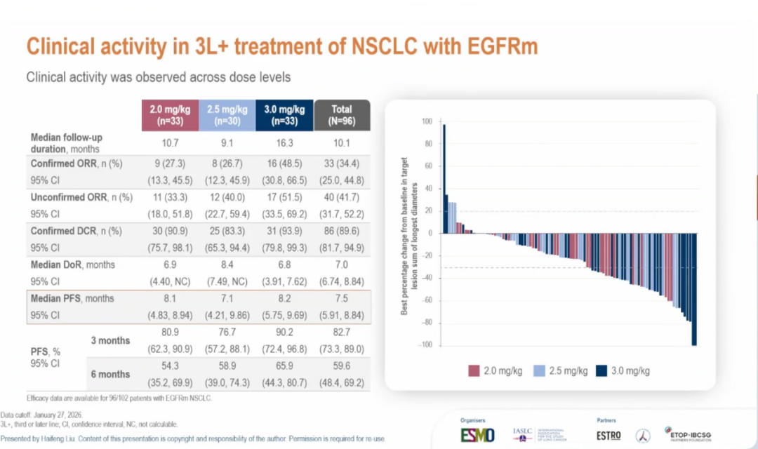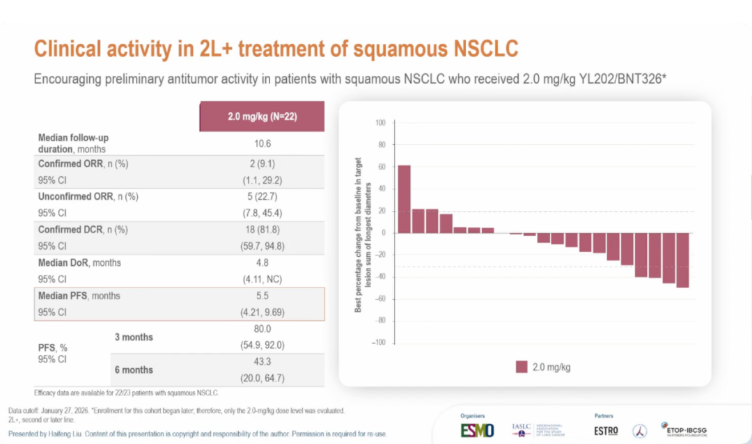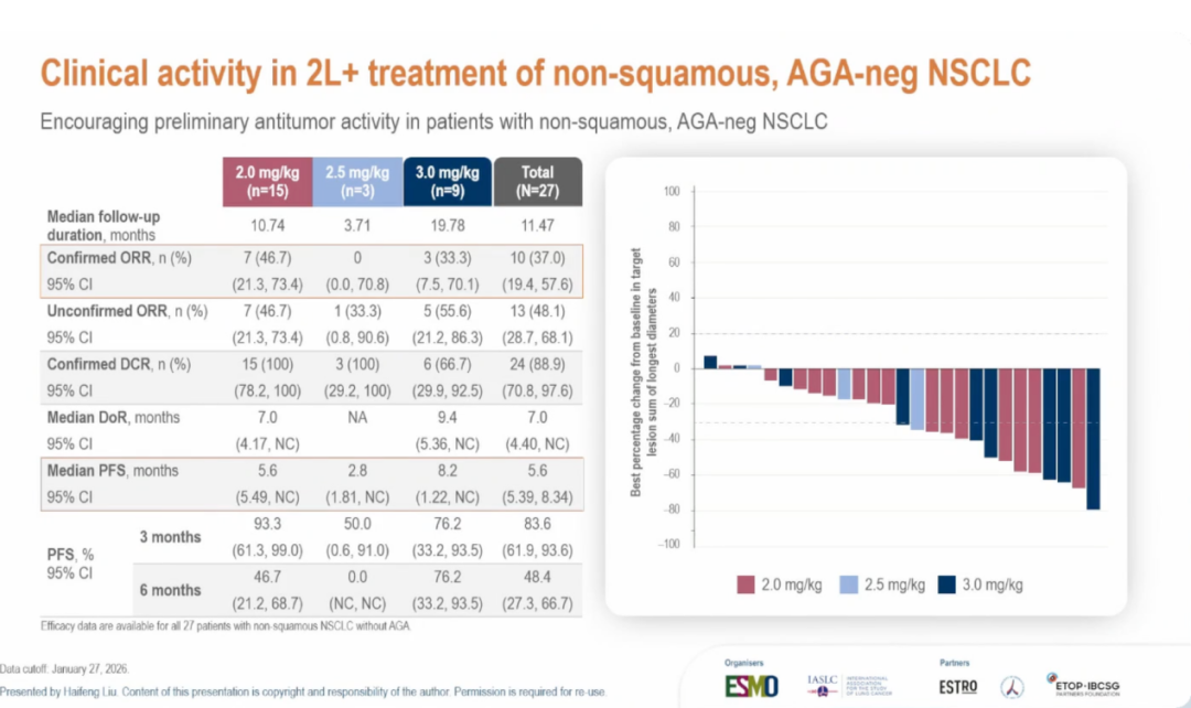 在非鳞状、无驱动基因突变NSCLC患者中,2.0 mg/kg剂量下确认ORR达46.7%,为HER3 ADC在该人群中的首次数据披露。