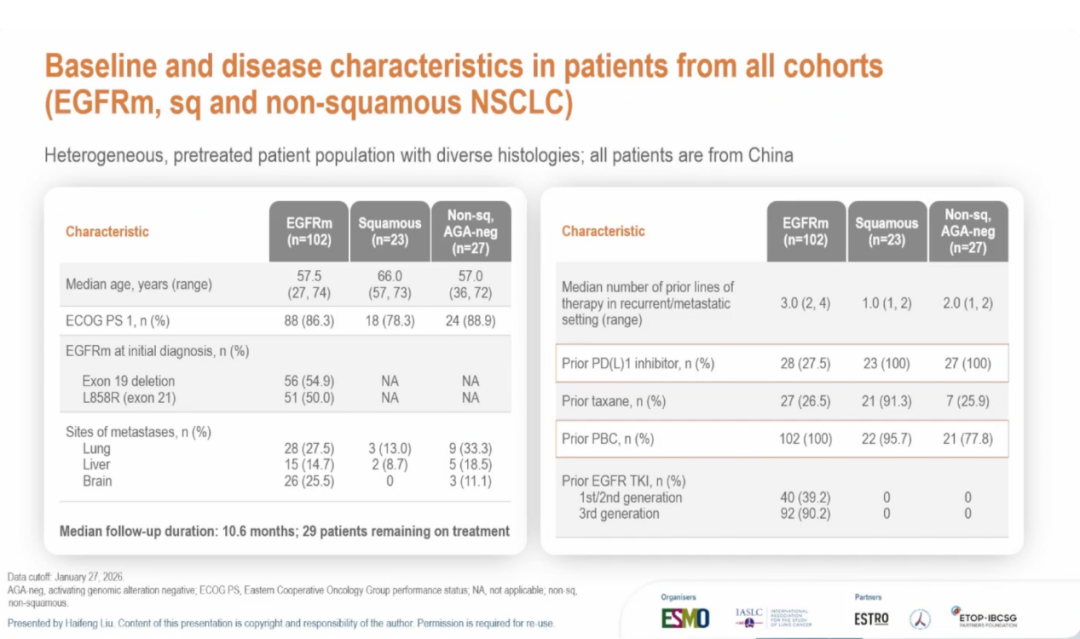 非鳞状、AGA-neg队列:中位年龄57.0岁,中位既往治疗线数为2线,全部患者接受过PD-(L)1抑制剂,77.8%接受过铂类化疗。