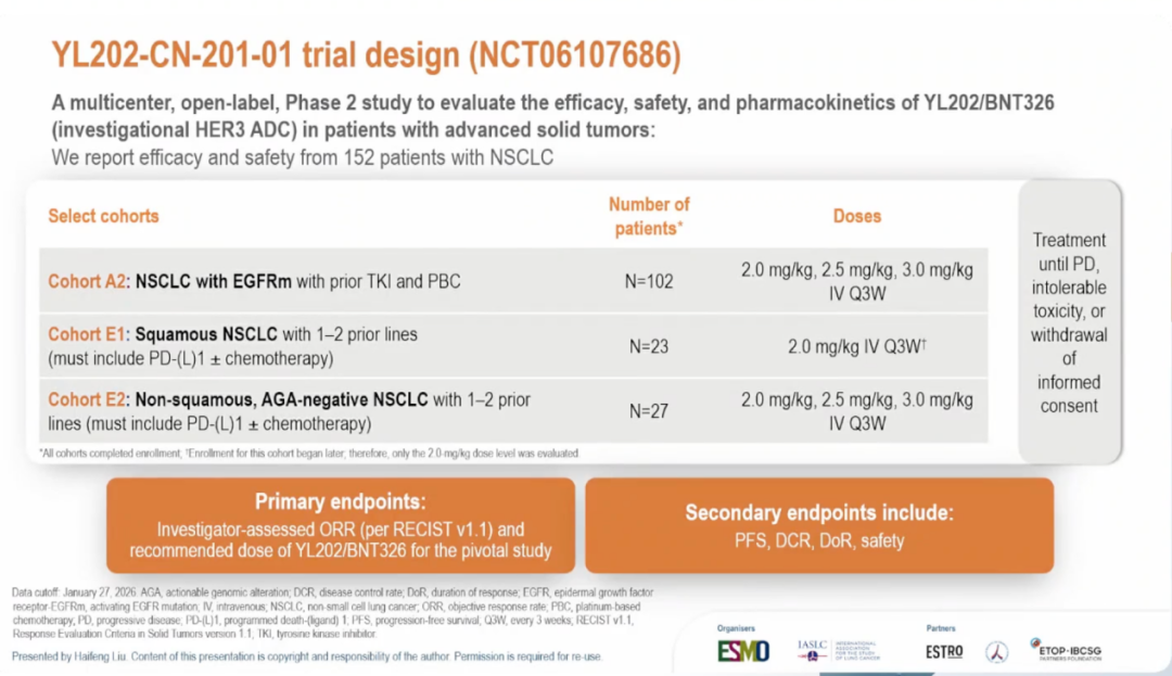 队列A2(EGFRm NSCLC):102例患者,既往接受过TKI和铂类化疗(PBC),分别接受2.0 mg/kg、2.5 mg/kg或3.0 mg/kg的YL202/BNT326静脉给药,每3周一次。