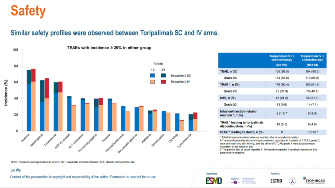 安全性方面,两组治疗相关不良事件(TRAE)发生率相似,分别为90.4%和91.4%,其中≥3级TRAE发生率分别为37.9%和40.1%。免疫相关不良事件(irAE)发生率分别为24.2%和21.3%,≥3级irAE分别为6.6%和7.1%。注射/输注相关反应在皮下注射组为1.0%(表现为皮疹、瘙痒或皮下硬结),在静脉注射组为3.0%。因TRAE导致特瑞普利单抗停药的比例分别为5.1%和4.6%。静脉注射组发生1例治疗相关死亡(急性乙型肝炎,该患者基线乙肝血清学标志物均为阴性)。总体而言,皮下注射与静脉注射的安全性谱一致,未发现新的安全性信号。