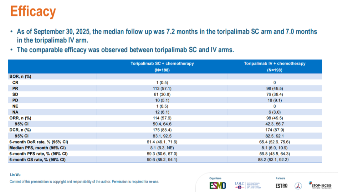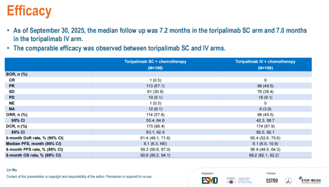 参考文献:Lin Wu,et al.Subcutaneous versus intravenous toripalimab,in combination with chemotherapy,as a first-line treatment for recurrent or metastatic non-squamous(nsq)non-small cell lung cancer(NSCLC):A randomized phase III trial.2026 ELCC.8MO.