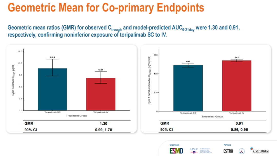 主要终点(药代动力学几何均值比):本研究共纳入396例患者,评估了皮下注射(SC,360 mg)对比静脉注射(IV,240 mg)特瑞普利单抗联合化疗的主要药代动力学参数。结果显示:皮下注射组在第1周期第2次给药前的血清谷浓度(Ctrough)几何均值比为1.30(SC/IV,90%置信区间:1.15–1.46),模型预测的第1周期0-21天浓度-时间曲线下面积(AUC0-21day)几何均值比为1.70(90%置信区间:1.52–1.90)。两个比值的90%置信区间下限均远高于预设的非劣效界值(0.8),表明皮下注射特瑞普利单抗的系统暴露量非劣效于静脉注射组,且数值上呈现出更高的暴露水平。