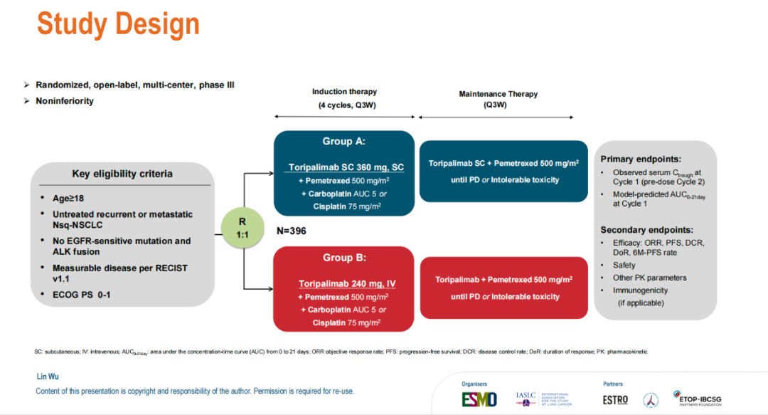 对于复发或转移性驱动基因阴性非鳞状非小细胞肺癌(Nsq-NSCLC)患者,免疫检查点抑制剂联合化疗已成为标准一线治疗方案。特瑞普利单抗(Toripalimab)是一种抗PD-1单克隆抗体,已证实其静脉制剂联合化疗可显著改善患者预后。然而,静脉给药需要反复住院输注,给患者带来不便,也增加了医疗资源的负担。皮下注射制剂具有给药时间短、操作简便、可居家治疗等优势,有望提高患者依从性和医疗资源利用效率。本研究旨在评估皮下注射特瑞普利单抗对比静脉注射剂型联合化疗在复发或转移性非鳞状NSCLC一线治疗中的药代动力学非劣效性、疗效及安全性。