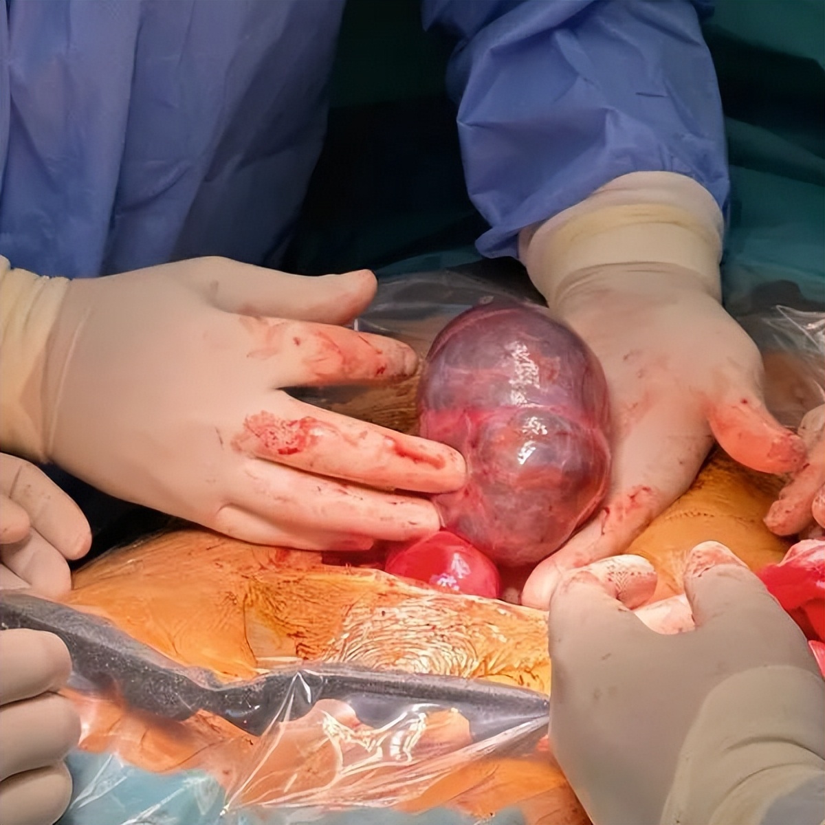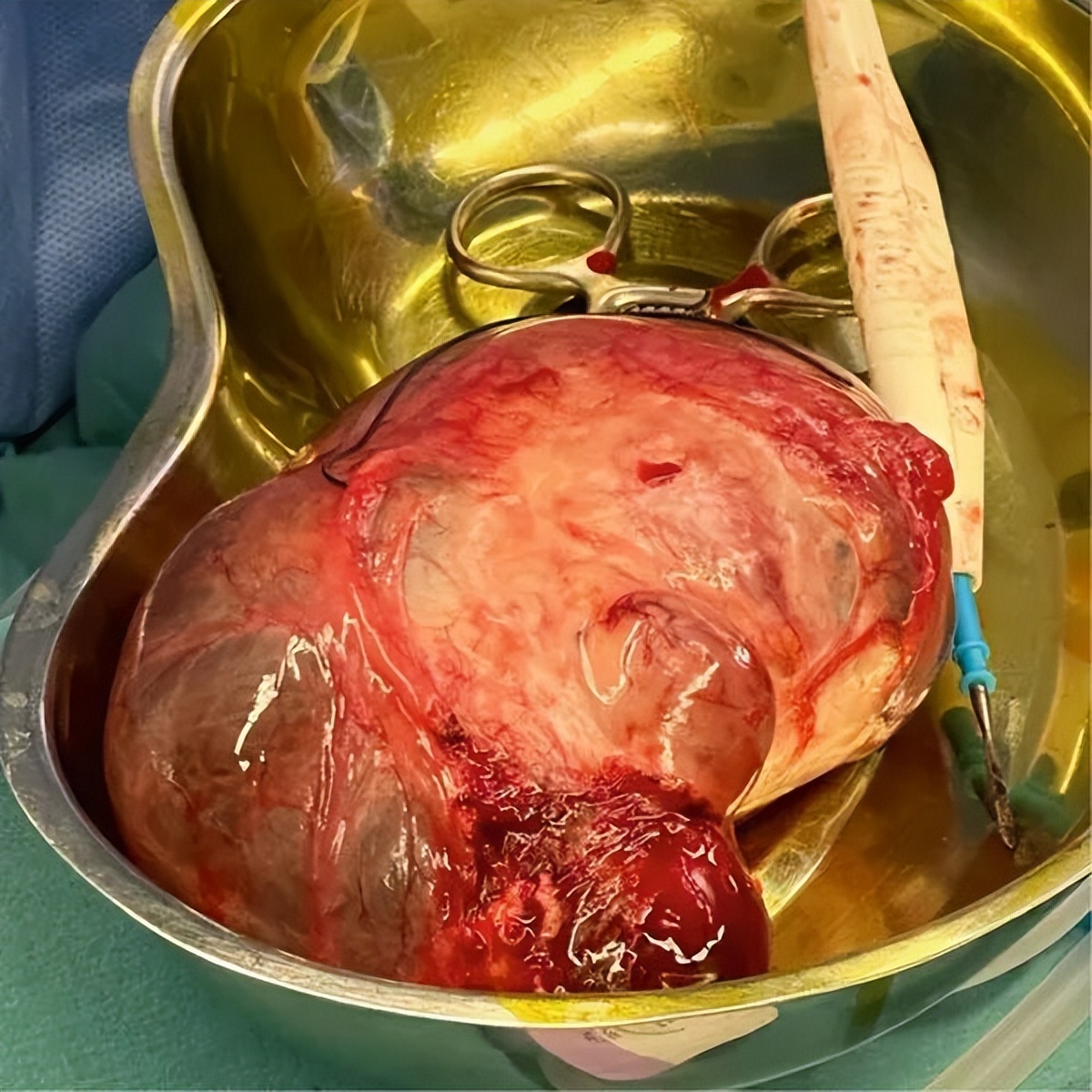 图4.术中照片显示卵巢囊肿切除术中的较大卵巢囊肿