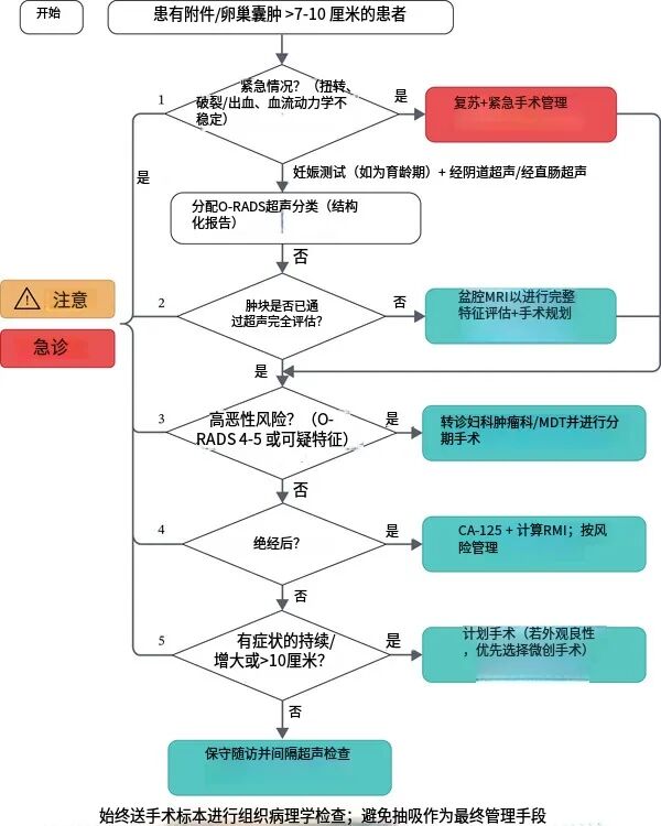 为辅助临床决策,我们提供了一个处理巨大卵巢囊肿(≥7-10厘米)的实用管理流程(图5),该流程整合了基于超声的结构化风险分层,并根据症状、大小、绝经状态和恶性肿瘤风险特征,决定是否升级为MRI检查、进行监测或手术。本病例再次强调,巨大卵巢囊肿的处理不应机械遵循既定流程,而需实现个体化决策。必须综合考量患者的个人意愿、生育需求以及详尽的影像学特征,从而制定出兼具安全性与有效性的手术方案。这充分凸显了精准影像学评估与精湛外科技术在改善患者预后中的核心作用。本例中未见恶性改变,进一步强调了在所有卵巢囊肿切除病例中进行细致组织病理学分析的必要性。