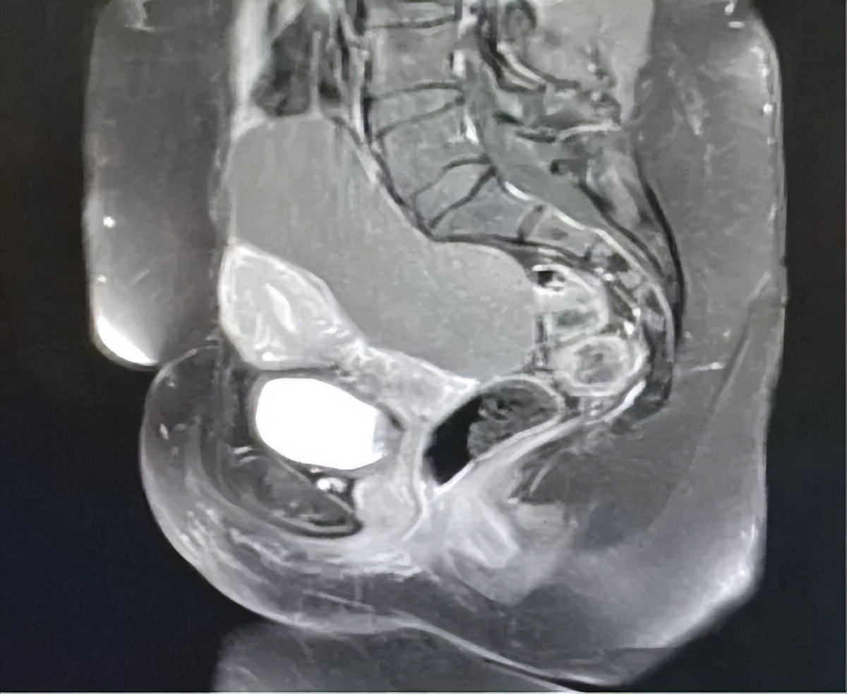 图1.增强磁共振成像显示右侧附件/卵巢有一个边界清晰的大囊性病变,大小为12×10×6 cm
