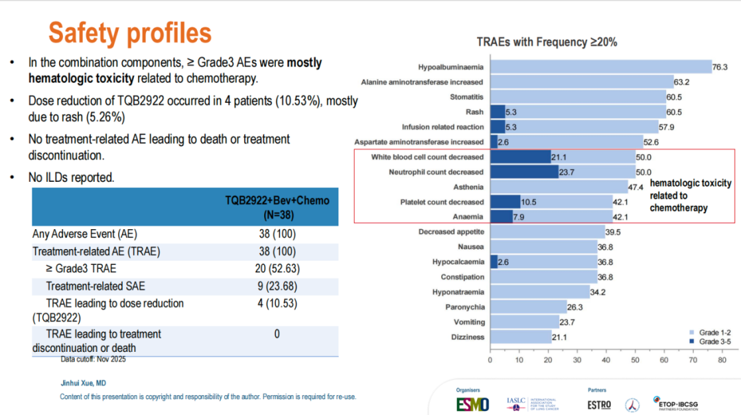 联合治疗中,≥3级不良事件主要为化疗相关的血液学毒性。4例患者(10.53%)因皮疹等原因减少TQB2922剂量。未发生治疗相关不良事件导致的死亡或治疗中断,亦无ILD报告。