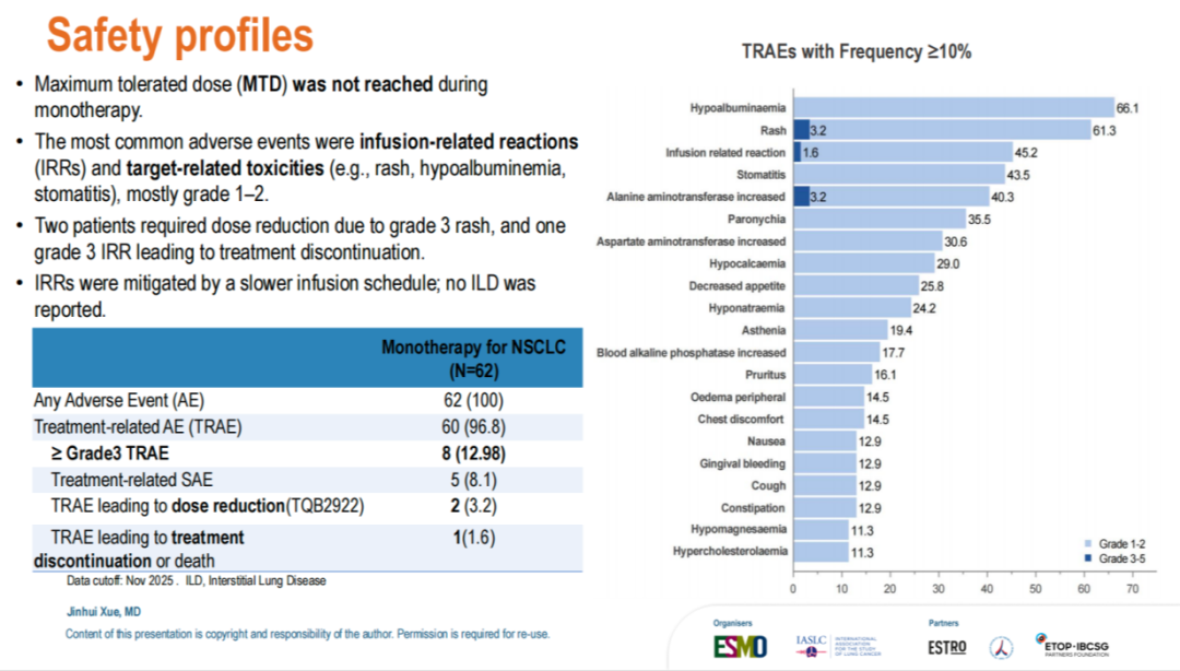 安全性方面:单药治疗中,最大耐受剂量(MTD)未达到。最常见的不良事件为输液相关反应及靶点相关毒性(如皮疹、低白蛋白血症、口腔黏膜炎),多为1~2级。2例患者因3级皮疹减量,1例因3级IRR终止治疗。通过减慢输注速度可缓解IRR。值得注意的是,未发现间质性肺病(ILD)。