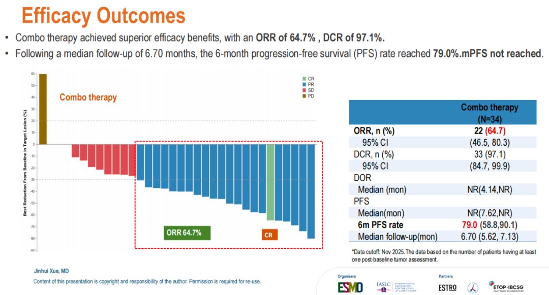 联合治疗组(34例可评估)显示出更优的疗效:ORR达64.7%,DCR为97.1%。中位随访6.70个月时,6个月无进展生存(PFS)率为79.0%,中位PFS尚未达到。