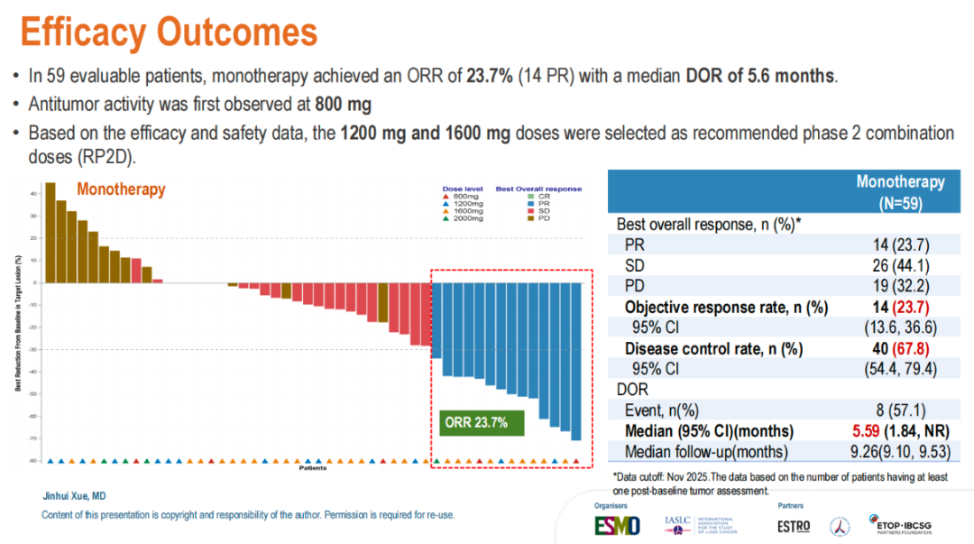疗效方面:在59例可评估的单药治疗患者中,尽管大部分患者接受过3线以上的既往治疗,客观缓解率(ORR)为23.7%(14例部分缓解),中位缓解持续时间(DoR)为5.6个月。疾病控制率(DCR)为67.8%。首次抗肿瘤活性在800mg剂量组观察到。基于疗效和安全性数据,选择1200mg和1600mg作为推荐的II期联合给药剂量(RP2D)。