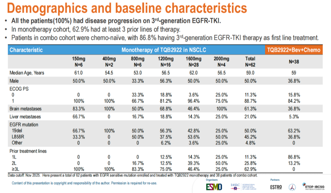 截至2025年11月数据截止,共纳入62例接受TQB2922单药治疗和38例接受联合治疗(TQB2922+贝伐珠单抗+化疗)的EGFR敏感突变患者。所有患者均曾对三代EGFR-TKI出现疾病进展。单药组中62.9%的患者既往接受过至少3线治疗;联合组患者均为化疗初治,其中86.8%接受三代EGFR-TKI作为一线治疗。