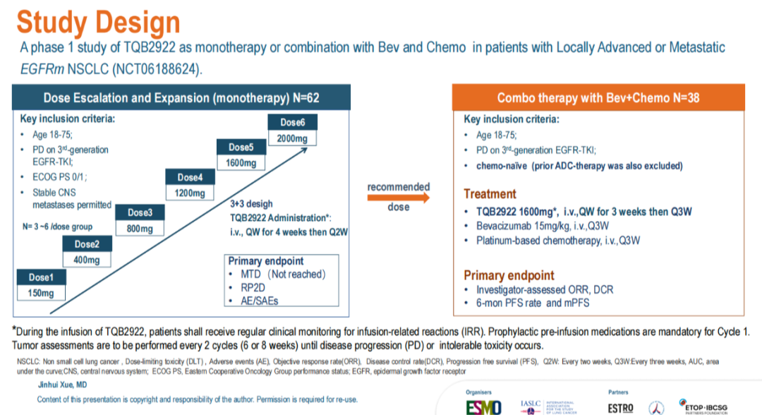 众所周知,第三代EGFR-TKI已成为EGFR突变晚期NSCLC的一线标准治疗,但耐药问题几乎是所有患者最终都会面临的挑战,其中c-MET通路的激活是最常见的旁路耐药机制之一。针对这一未被满足的临床需求,我们团队开展了TQB2922的I期临床研究。TQB2922是一种结构新颖的EGFR/c-MET双特异性抗体,其非对称设计在增强c-MET抑制作用的同时,有望减少EGFR靶向相关的毒性。