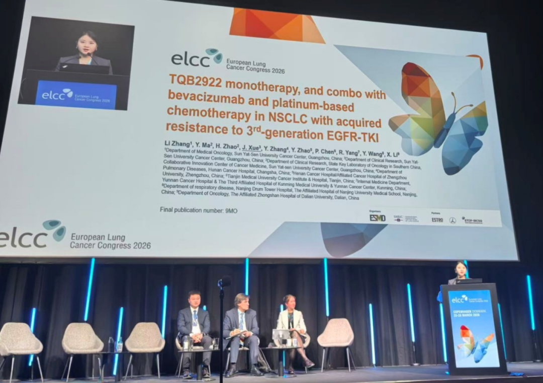 2026年欧洲肺癌大会(ELCC)于3月25日至28日在丹麦哥本哈根盛大召开。作为胸部肿瘤学领域的国际顶级盛会,ELCC汇聚了全球前沿的科研成果与临床智慧。在本届大会上,来自中国的多项研究再次成为焦点,其中,中山大学肿瘤防治中心张力、赵洪云教授团队薛锦慧博士汇报的一项“EGFR/c-MET双特异性抗体TQB2922单药及联合贝伐珠单抗和化疗治疗EGFR突变非小细胞肺癌”的首次人体I期研究成果入选大会口头报告(摘要号:9MO)。该研究针对第三代EGFR-TKI耐药后这一临床难题,创新性地探索了双特异性抗体的联合治疗策略,为耐药患者提供了极具潜力的全新选择。
