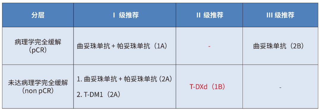 在辅助治疗阶段,既往推荐方案是,pCR患者延续抗HER2治疗至1年;non-pCR患者可按强化策略选择(如T-DM1)以降低复发风险。如今,DESTINY-Breast05(DB05)研究结果显示,T-DXd用于新辅助治疗后non-pCR的高危患者时,可较强化辅助治疗原标准T-DM1,进一步使患者疾病复发或死亡风险显著下降53%,且对部分既往预后不佳的患者疗效依然明显。基于上述循证证据,新版指南中也增加了T-DXd并进行II级推荐(1B),确立了其在新辅助治疗后non-pCR患者中的强化辅助治疗地位。