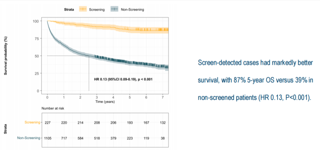 肺癌患者总生存:在确诊肺癌的患者中,筛查发现的肺癌病例(n=227)相比非筛查发现的肺癌病例(n=1105)显示出显著更优的总生存期,风险比仅为0.13(95%CI:0.09–0.19,P<0.001),5年生存率也明显提高。