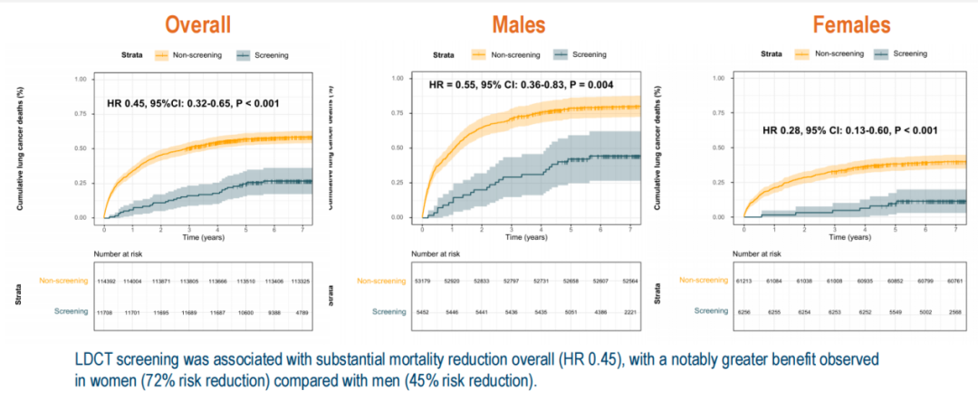 肺癌死亡风险:中位随访7.0年结果显示,筛查组相较于非筛查组的肺癌特异性死亡风险显著降低55%(HR=0.45,95%CI:0.32–0.65,P<0.001)。性别亚组分析显示,女性筛查获益更为显著,肺癌死亡风险降低72%(HR=0.28,95%CI:0.13–0.60,P<0.001);男性则降低45%(HR=0.55,95%CI:0.36–0.83,P=0.004)。