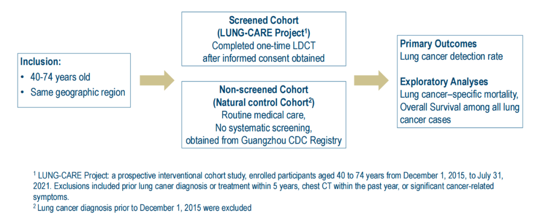 本研究为一项前瞻性、干预性、非随机对照研究。筛查队列来源于LUNG-CARE项目,入组时间为2015年12月1日至2021年7月31日,纳入标准为40–74岁,在签署知情同意后接受一次性LDCT筛查。排除标准包括:既往肺癌诊断或5年内接受过肺癌治疗、过去一年内曾行胸部CT检查、或存在明显肿瘤相关症状。非筛查队列(对照组队列)则为来自同一地区、同年龄段、未接受LDCT系统性筛查的自然对照人群,并排除了2015年12月1日之前诊断肺癌的个体。最终,筛查组纳入11,708例,非筛查组纳入114,392例。