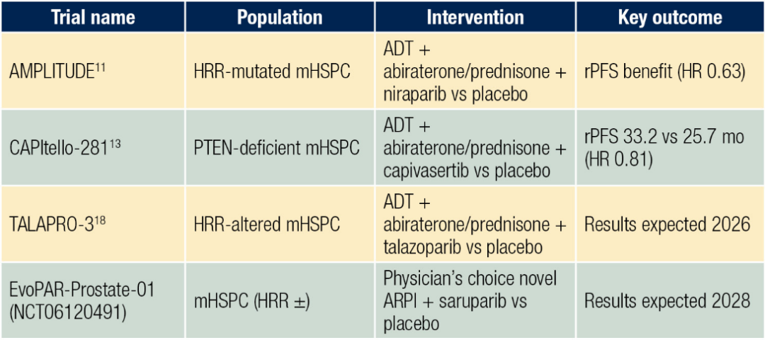 2、近期和正在进行的III期临床试验(包括AMPLITUDE、CAPItello-281和TALAPRO-3等研究),有望为mHSPC的个体化治疗积累循证医学证据。
