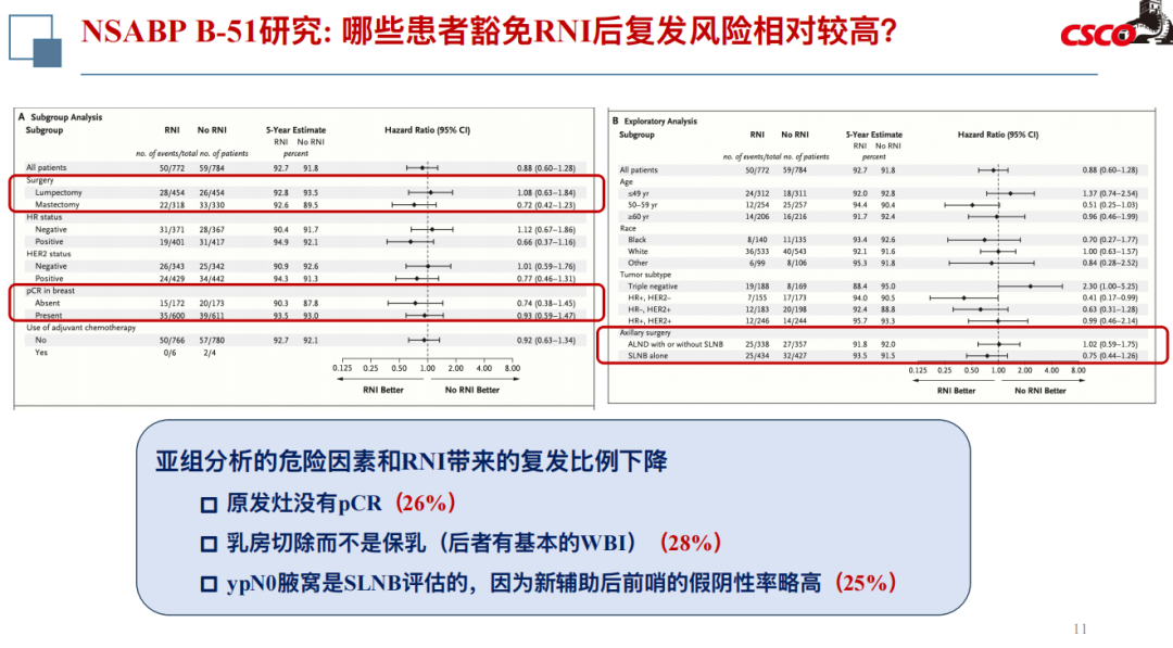 当然,该研究中也观察到三个亚组的患者在豁免区域淋巴结放疗后复发风险有所升高。第一类是接受乳房切除术而非保乳手术的患者。这类患者若豁免区域放疗,则等于豁免了整个术后放疗,完全失去了对区域淋巴结的保护,其复发风险升高了28%。第二类是腋窝淋巴结达到pCR但原发灶未达pCR的患者,豁免区域放疗后复发风险升高了26%。第三类是通过前哨淋巴结而非腋窝淋巴结清扫评估腋窝pCR的患者。新辅助化疗后,通过前哨淋巴结评估ypN0的假阴性率高于未接受新辅助化疗的患者。对于这类患者,我们同时豁免了腋清和区域淋巴结照射,风险会略有增加。因此,在临床实践中,对于符合上述三个特征的患者,豁免区域照射应适当谨慎。